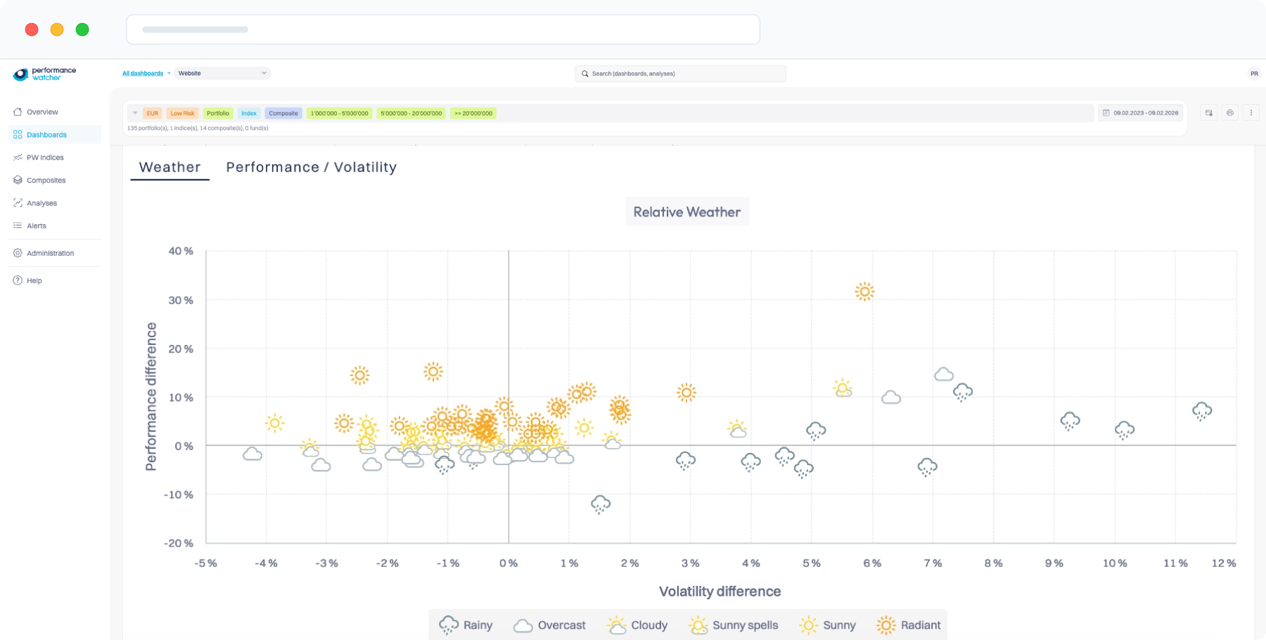A “sunny” or “cloudy” status makes complex risk/return metrics instantly understandable for non-experts.