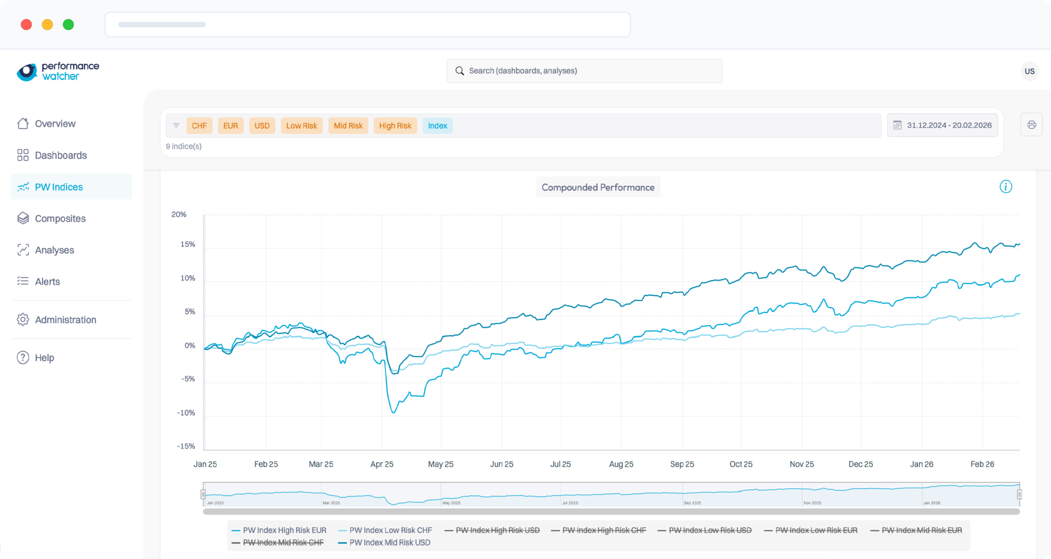 Move beyond single-line reporting. Automatically aggregate your portfolios into Composites to visualize the weighted performance of your specific strategies. Validate your Alpha with objective precision against the Performance Watcher Indices (PWI+) to see exactly how your management style performs against the relevant peer group.