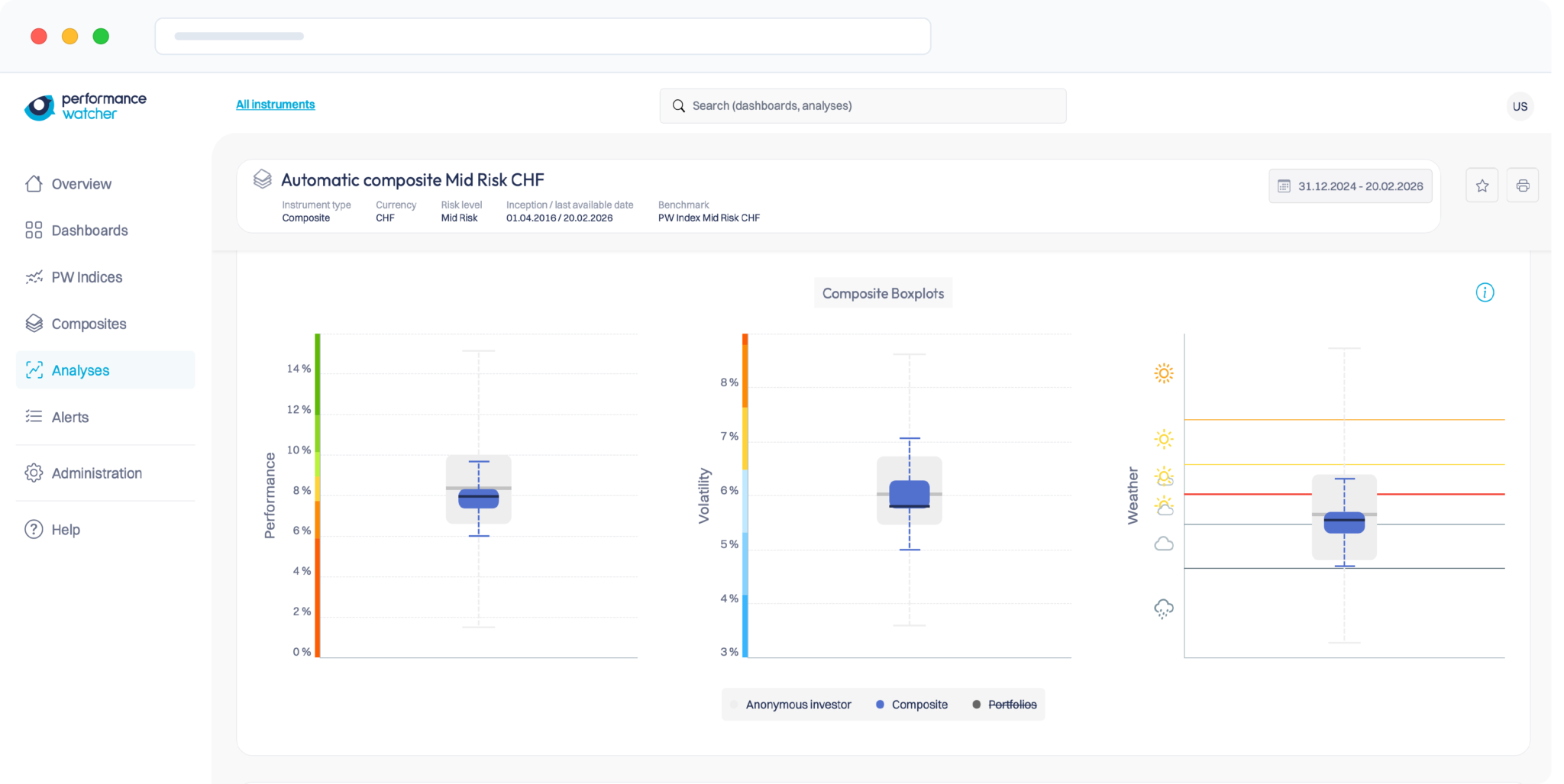 The Perfometer transforms sophisticated analysis into an intuitive visual standard. It provides an immediate outlook on your risk/return balance to answer the essential question: “Is our performance competitive?”.